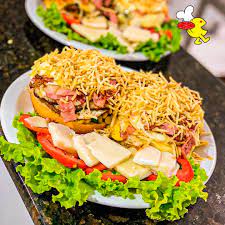 pão ,3 carnes ,ovo ,bacon ,frango ,presunto ,mussarela ,alface ,tomate ,milho verde batata palha e batata frita